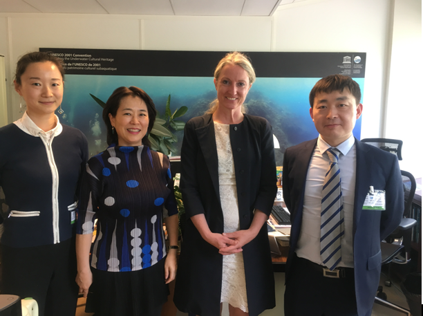 4月23日中午,《水下文化遗产保护公约》秘书处Ulrike Guerin女士专门会间了中国代表团,听取了我国水下文化遗产保护与法律的情况。王铮副处长向Ulrike 女士介绍了中国近几年水下文化遗产参加国际交流合作的情况以及中国希望跟公约秘书处进一步合作保护水下文化遗产的想法。刘丽娜介绍了中国《水下文物保护条例》(征求意见稿)的修订的情况以及中国水下文化遗产法律保护与国际公约的关系。Ulrike Guerin女士非常高兴中国在水下文化遗产在国际交流领域取得的可喜成果,肯定了中国对水遗法律保护的重视。她特别指示希望能跟中国在水下考古培训、法律等方面提供帮助或进一步合作,并表示会全力支持中国水下遗产保护工作。