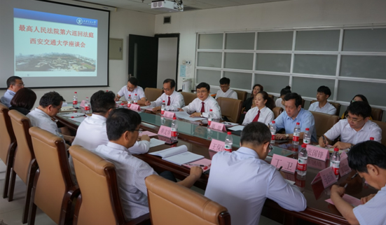 庭审结束后,最高人民法院第六巡回法庭—西安交通大学座谈会在主E910会议室召开,第六巡回法庭张明副庭长和专职党务干部(廉政监察员)郭利然带领其庭审与管理团队、西安交大席光副校长、法学院访问教授、牛津大学常务副校长Ewan McKendrick、社科处贾毅华处长以及法学院领导及师生代表数十人参加了座谈会。
