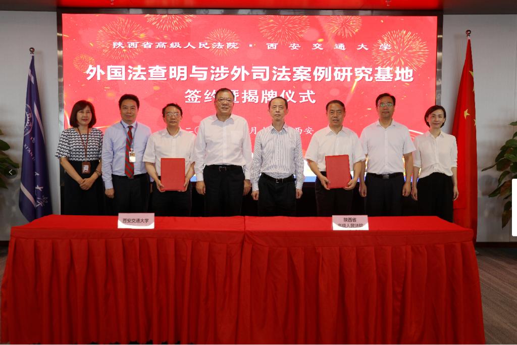 陕西省高级人民法院办公室主任王玉刚、民三庭庭长王建敏、西安交通大学社科处处长贾毅华、陕西省高级人民法院民三庭全体法官及助理,西安交通大学法务办、法学院、丝绸之路国际法与比较法研究所相关负责人参加了活动。签约暨揭牌仪式由西安交通大学法学院院长单文华主持。
