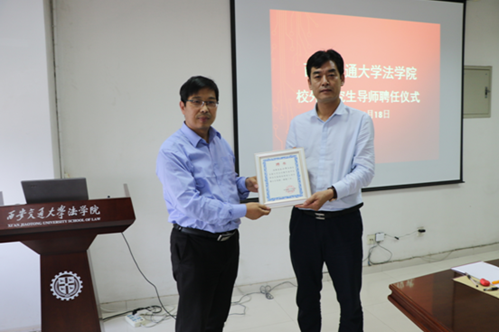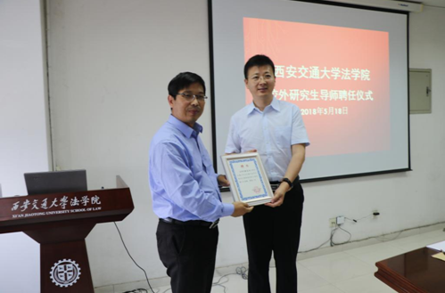 2018年5月18日下午,西安交通大学法学院法律硕士研究生“协同培养育人项目”校外导师(首批)聘任仪式暨专业实践课程教学研讨会在兴庆校区教学主楼910会议室举行。法学院党总支书记王保民教授、副院长李万强教授、副院长丁卫副教授,院长助理张生副教授、教师代表吴锐讲师和研究生代表参加了聘任仪式。
