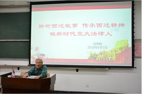 5月7日下午,原西安交通大学党委书记、全国人大常委会委员潘季教授应法学院邀请在主B105为学院师生带来题为“聆听西迁故事传承西迁精神做新时代交大法律人”的讲座。法学院单文华院长、王保民书记、李万强副院长、丁卫副院长出席了此次报告会。参会人员还有法学院本科生、研究生及全体教工。