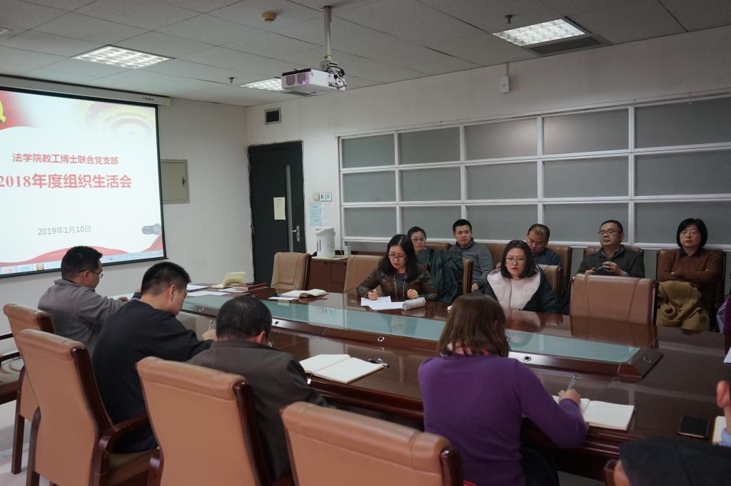2019年1月10日下午,法学院教工博士联合党支部在主E-910召开2018年度组织生活会,开展支部书记述职、民主评议支部、民主评议党员等工作。教工博士联合党支部党员参加了此次组织生活会,法学院副院长李万强出席。会议由支部书记吉兰湘老师主持。