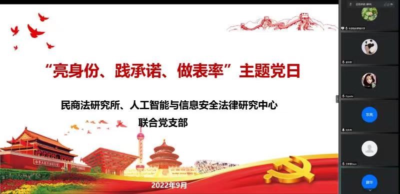 9月28日,法学院民商法研究所、人工智能和信息安全法律研究中心联合党支部开展“亮身份、践承诺、做表率”主题党日活动。活动通过线上形式举行,由支部书记薛华主持。