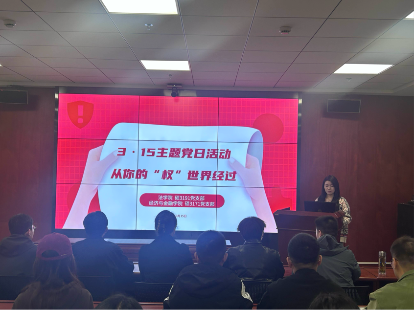 每年的3月15日,是由国际消费者联盟组织于1983年确定的国际消费者权益日(World Consumer Rights Day)。为提高同学们对消费者权益保护的认识,增强其在消费中利用法律手段维护自身权益的意识和能力,法学院硕3191党支部联合经济与金融学院硕3171党支部,于3月15日19:00在创新港校区涵英楼3001教室开展3·15主题党日活动。本次活动由法学院硕3191党支部书记刘芮言主持,活动主要内容为消费者侵权研究分享。