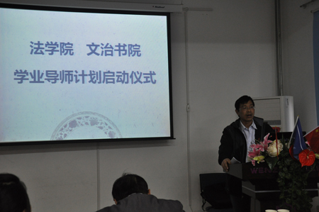 2011年10月14日下午4:00,由法学院与文治书院联合开展的“学业导师启动仪式暨法学专业学业分析报告会”在文治书院报告厅举行,法学院党总支书记彭沪生老师、法学院副院长王保民教授、院长助理吉兰湘老师和文治书院常务院务副主任张爱萍老师、院务副主任郭小平老师参加了会议。法学院各年级学业导师、法学院两个教务员老师、文治书院各年级辅导员老师以及法学院全体本科生也参加了会议。会议由文治书院任欣老师主持。