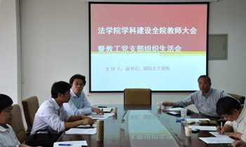 单文华院长首先作了关于法学院学科建设动员讲话。他表示当前学院学科建设工作的重心就是要全院同心同德,争取法学一级学科博士点。他深入分析了学院学科建设的形势,号召大家众志成城,齐心协力,积极配合学院相关工作,为学院学科新跨越贡献自己的智慧和力量。接着,马治国副院长、马民虎教授、胡德胜教授分别讲话,表示要全院一心,做好各项相关工作。