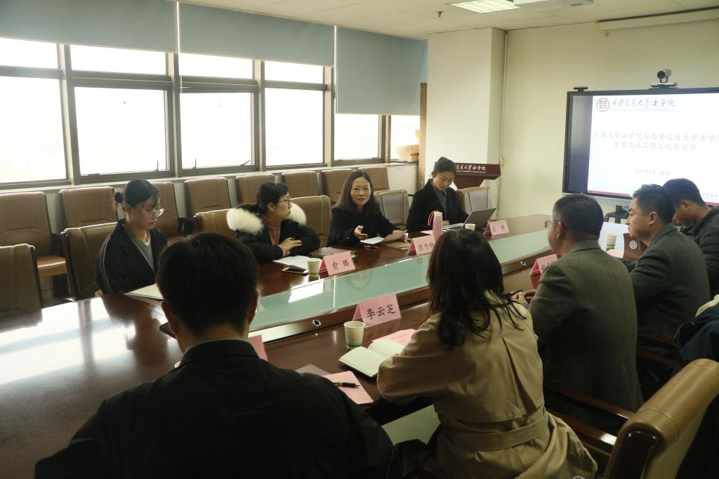4月2日,云南大学法学院党委副书记刘蔓琦一行来访西安交通大学法学院,双方就学生就业工作开展交流座谈。法学院学生工作专职委员张乃钟、文治书院辅导员俞璐及法学院兼职辅导员占妮、就业工作助理丛珊参加了座谈会。