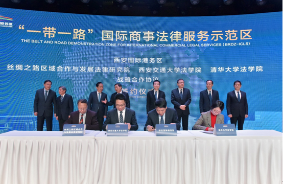 国家级“一带一路”国际商事法律服务示范区是陕西省、西安市和最高人民法院、司法部等国家有关部门在西安交通大学建议基础上决定建设的我国第一个也是目前唯一一个国家级法律服务示范区。2017年7月,西安交通大学党委依据法学院院长单文华教授及其团队的研究成果,以要报形式向最高人民法院、司法部、陕西省委省政府以及西安市委市政府提出了《关于建立国家级“一带一路法律服务与法治创新示范区”的建议》,先后得到了最高人民法院院长、司法部部长以及陕西省委省政府和西安市委市政府主要领导同志的批示肯定和支持。2018年7月,西安交通大学与西安市人民政府正式签约,决定共建“一带一路”法律服务与法治创新示范区(简称“中央法务区(Central Legal-services District,CLD)”)以及“一带一路”国际争端管理中心。