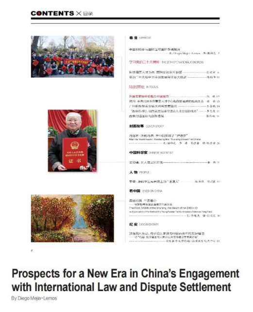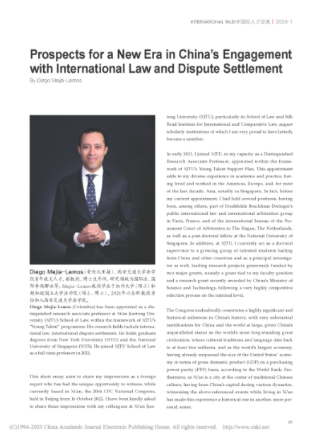 日前,我院青年拔尖人才、法学院副教授Diego Mejía-Lemos以“Prospects for a New Era in China's Engagement with International Law and Dispute Settlement”(中国积极参与国际法和国际争端解决)为题在《国际人才交流》2023年第1期发表文章,分享他对习近平总书记在中国共产党第二十次全国代表大会上所作报告的感想,文章被作为该期“卷首”进行推介。