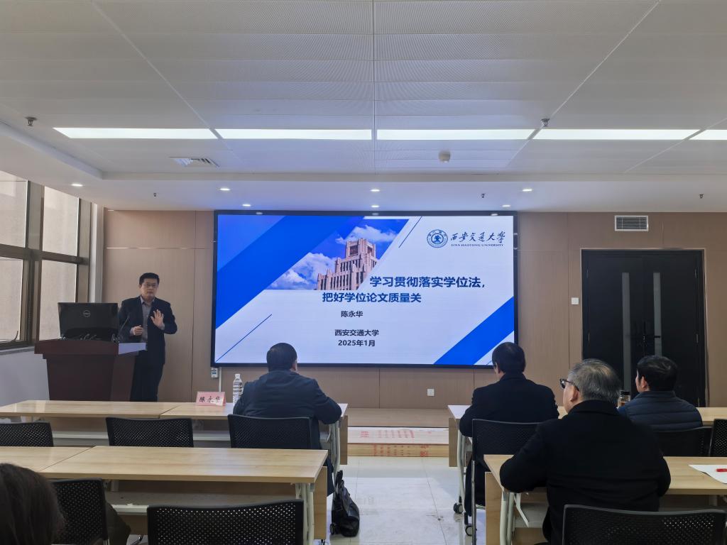 陈永华主任以“学习贯彻落实学位法,把好学位论文质量关”为题作报告。他详细解读了《学位法》《西安交通大学学位授予工作办法》《西安交通大学关于进一步加强研究生学位论文质量保障的若干意见》等学位管理文件,通报了学校学位授予、学位质量保障、学术不端处理以及导师管理规定等情况,并就导师牢把学位论文质量关、实现论文抽检“零问题”分享了自己的思考和建议。