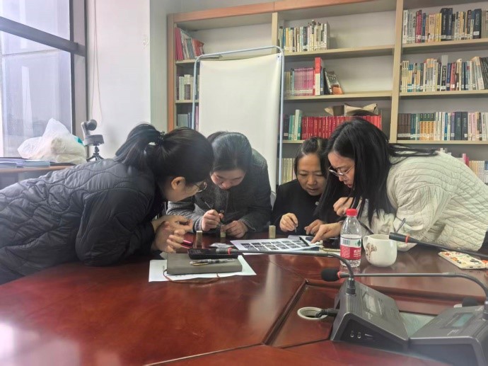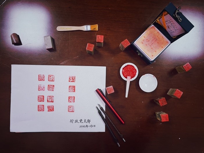 辩论结束后,支部以 “篆在石上,刻在心里” 为主题开展篆刻实践活动。在支部成员张隽岩的指导下,党员们亲手雕刻“爱”“国”“党”“校”“教”“育”等主题印章,将党的精神内涵融入传统技艺。在“一刀一划”的专注中,体悟文化传承与党性锤炼的深度融合,把精神内涵转化为具象印记,切实强化理想信念与责任担当。