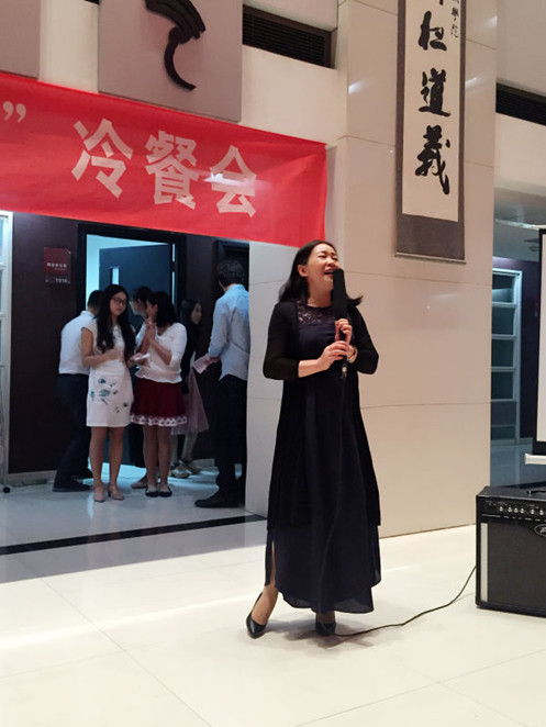 冷餐会上,法学院师生在品尝美味的水果、点心的同时,一起欣赏了师生们带来的精彩表演。来自马里的留学生吴茜同学带来一首充满异域风情的民族歌曲,让同学们领略到不同文化的色彩。来自澳大利亚的留学生多米尼克和研一新生刘静洁分别用英语和法语共同演绎了诗朗诵《再别康桥》。中文经典诗歌在其他语言的演绎下显得别具一格。研一新生唐雅雯身着中国古典服装,向留学生们展示了我国传统舞蹈《惊鸿舞》,令人惊艳。研一新生蒲凯云、刘敏丹、田思艺,本科新生吴彦博分别为大家带来了动听的歌曲,赢得了现场的喝彩与掌声。在欢乐的气氛中,吉兰湘老师用日语为大家演唱的歌曲《我只在乎你》,赢得大家的阵阵掌声;张乃钟老师演唱的豫剧选段《谁说女子不如男》,字正腔圆、韵味醇厚,受到了师生们的热烈欢迎。