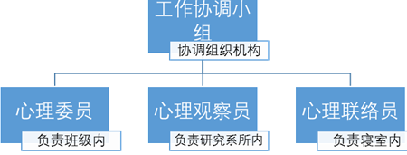 研究生承担的是从事科学研究和接受课程教育双重任务,主要活动场所出了班级之外更多的是研究系所。学院工作协调小组在关注到这一特殊现象之后,决定除依照原有模式在班级设立心理委员负责关注本班同学的心理健康状况之外还创新性的在个科研系所设立了心理观察员,负责所在系所的心理健康观察和引导活动,在各个宿舍设立了心理健康联络员,负责所在宿舍的心理健康工作联络活动。通过这一举措,建立起了从心理健康工作协调小组到心理委员、心理观察员、心理联络员等全方位、多角度的心理健康工作体系,能够24小时全时段及时关注、解决学生在学习、科研、教学等三个方面的心理健康问题和需求,成功构建起全方位、多层次的心理健康工作体系。