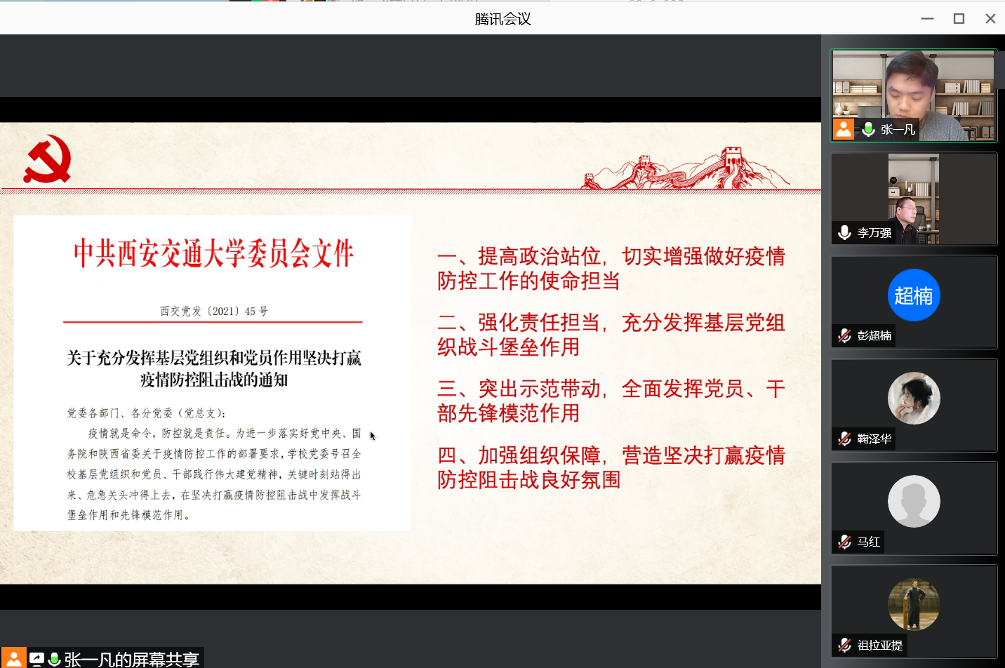 硕1173支部全体成员纷纷表示,将继续团结协作,遵守校园防疫规定,为抗击疫情贡献力量。相信在默默奋斗的无数前线抗疫人员以及大家的共同努力下,西安终将战胜疫情,打赢这场疫情防控阻击战。会议在大家的新年祝福中进入尾声。